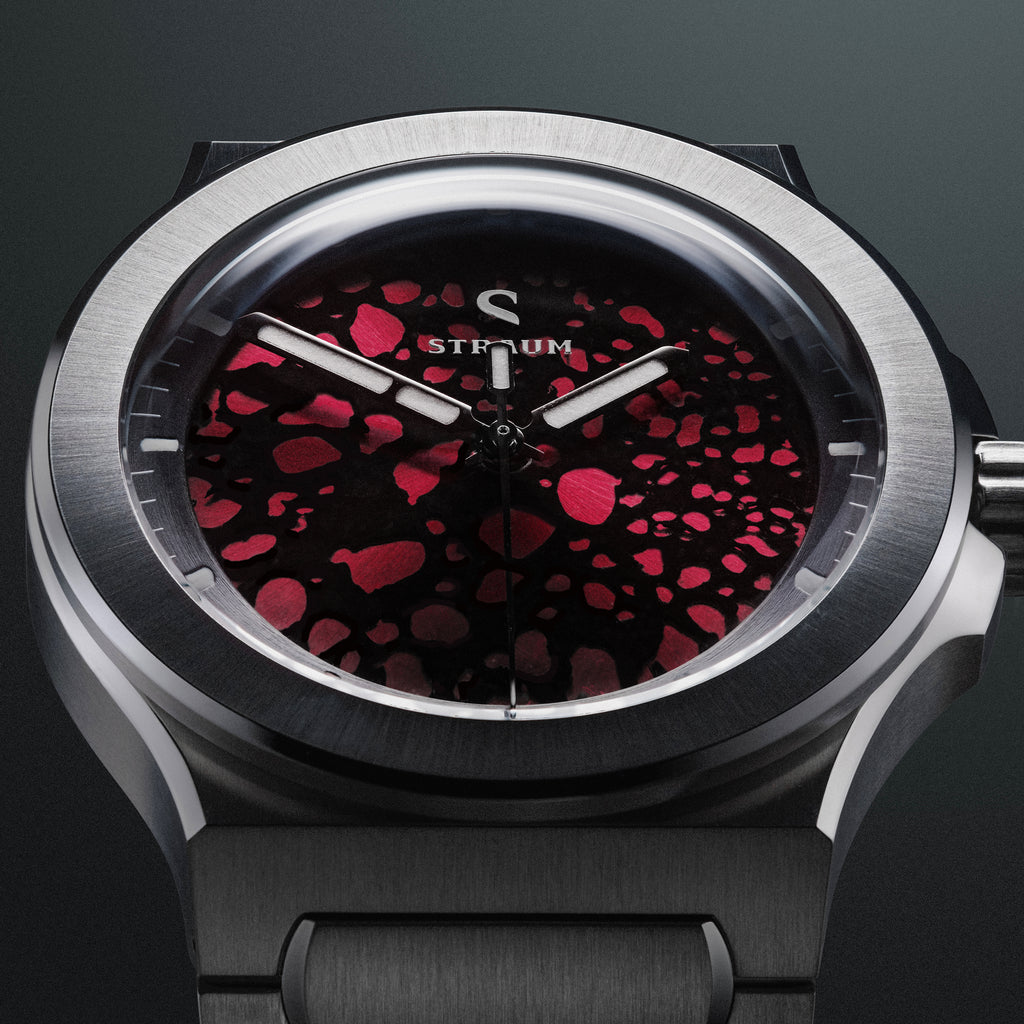 The Jan Mayen Basalt Red is a Limited Edition watch, crafted from basalt rock collected during a two-week expedition to the remote volcanic island of Jan Mayen. Each dial, formed from solidified lava and gas pockets, showcases one-of-a-kind natural patterns, making every watch distinct. The ultra-thin basalt wafers are precisely cut, stabilized, and polished, then layered over a red, sunburst-textured base plate in a sandwich dial construction.