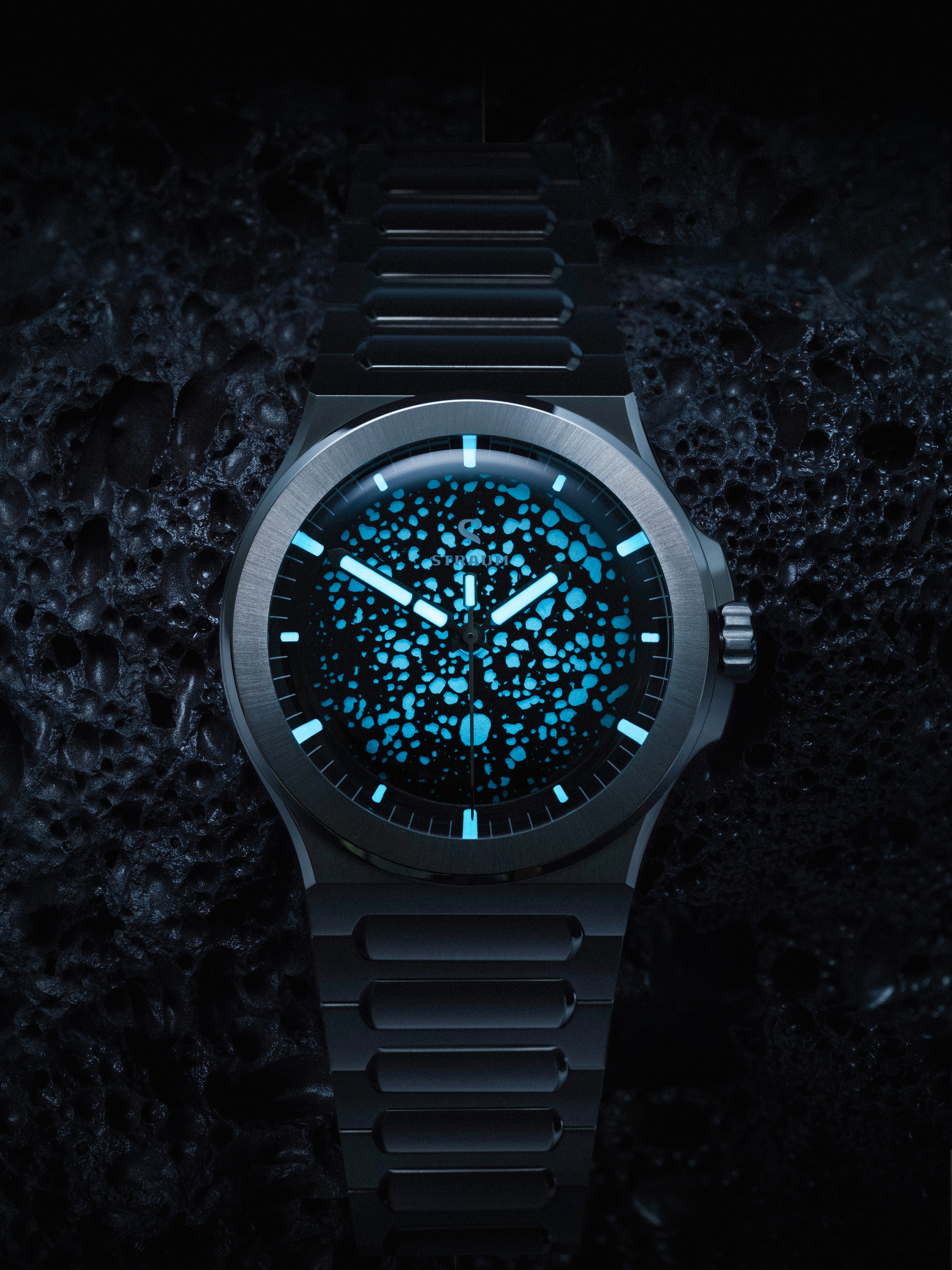 The Jan Mayen Basalt Lume dial is carefully crafted from volcanic basalt rock, selected for its porous, unique structure. The brittle material undergoes a multi-step process of stabilization to strengthen it without compromising its natural texture. Precision tools are used to cut ultra-thin wafers, which are then ground, polished, and treated with resin to enhance durability and achieve optical clarity. The wafer is bonded to a fully lumed base dial with a fumé treatment, producing a gradient glow that emanates subtly from the center outward, while retaining legibility. Finished with a chapter ring, this process results in a truly one-of-a-kind watch face that captures the raw beauty of the basalt and showcases nature’s powerful forces.