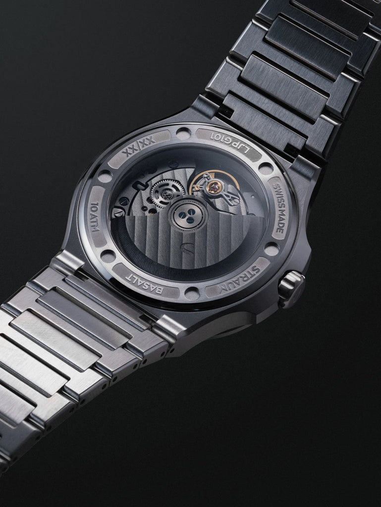 The Jan Mayen Basalt features the LJP G101 movement by La Joux-Perret, renowned for its precision, craftsmanship, and a reliable 68-hour power reserve. This time-only display allows for an uninterrupted view of the dial's unique basalt design. The movement is Soigné graded and NAC-treated, ensuring both enhanced durability and an elegant finish. Adjusted to four positions for precise timekeeping, the movement and engraved rotor are visible through the sapphire crystal window on the screw-down caseback.
