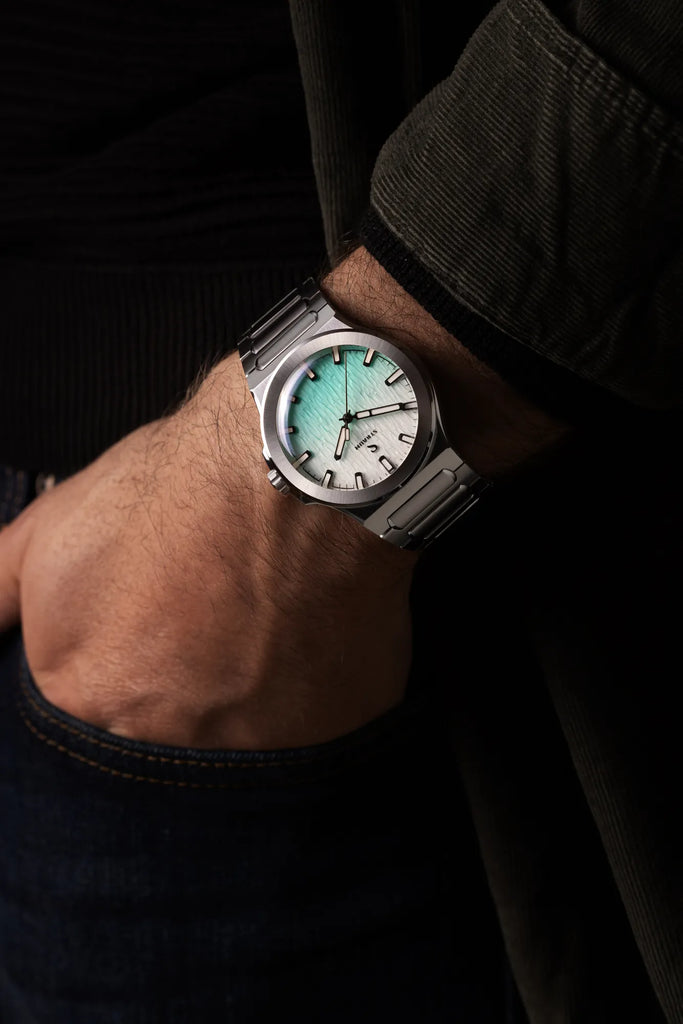 The bracelet is specially designed to endure the harsh conditions of the Arctic with its custom-engineered structure. It is made from Stainless Steel 316L and features a seamless integrated design that tapers from 24.8mm to 18mm at the buckle, ensuring a comfortable and snug fit on your wrist. The push-button butterfly clasp is custom-designed and seamlessly integrated, providing a sleek and secure closure for the bracelet. The two 130% links also allow for a precise and tailored fit to your wrist. Whether you're out in the wilderness or in the city, this bracelet is built to last and will withstand even the harshest environments.