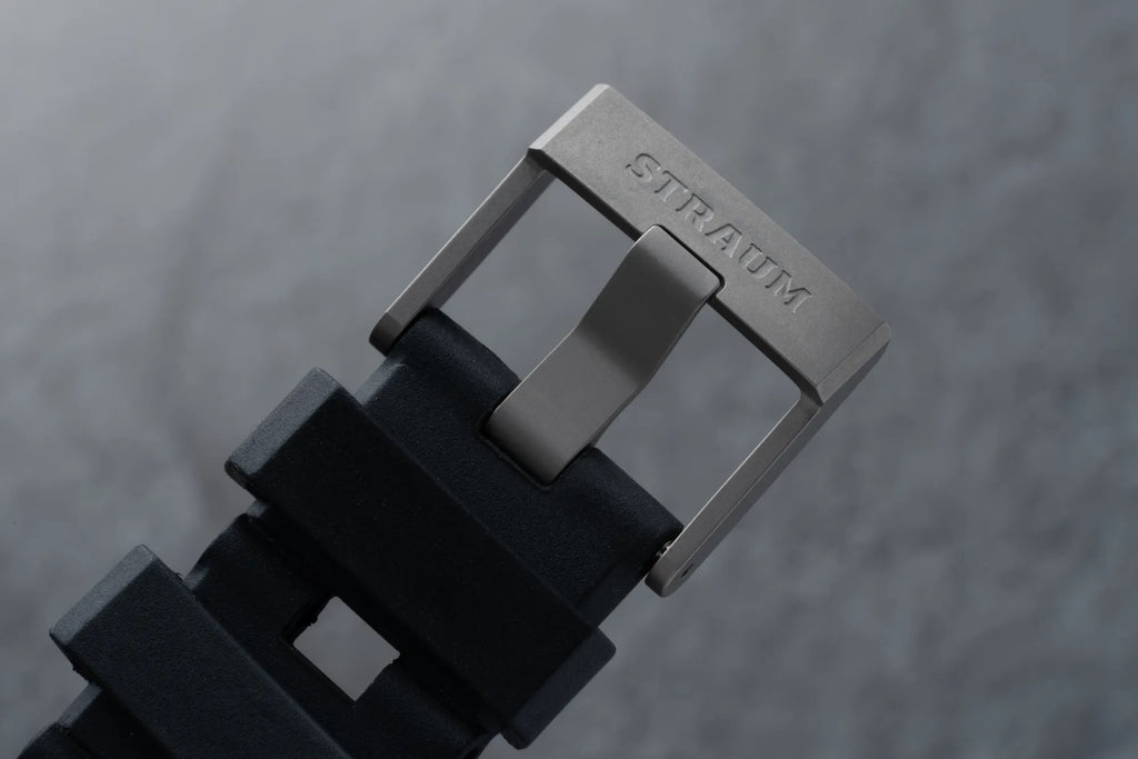 The FKM Rubber Bands integrate seamlessly into the case via the Straum Coupling in Grade 5 Titanium. The curved tip follows the wrist’s natural shape, while the raised profile improves ventilation. They pair with the Straum buckle, machined from Grade 5 Titanium.