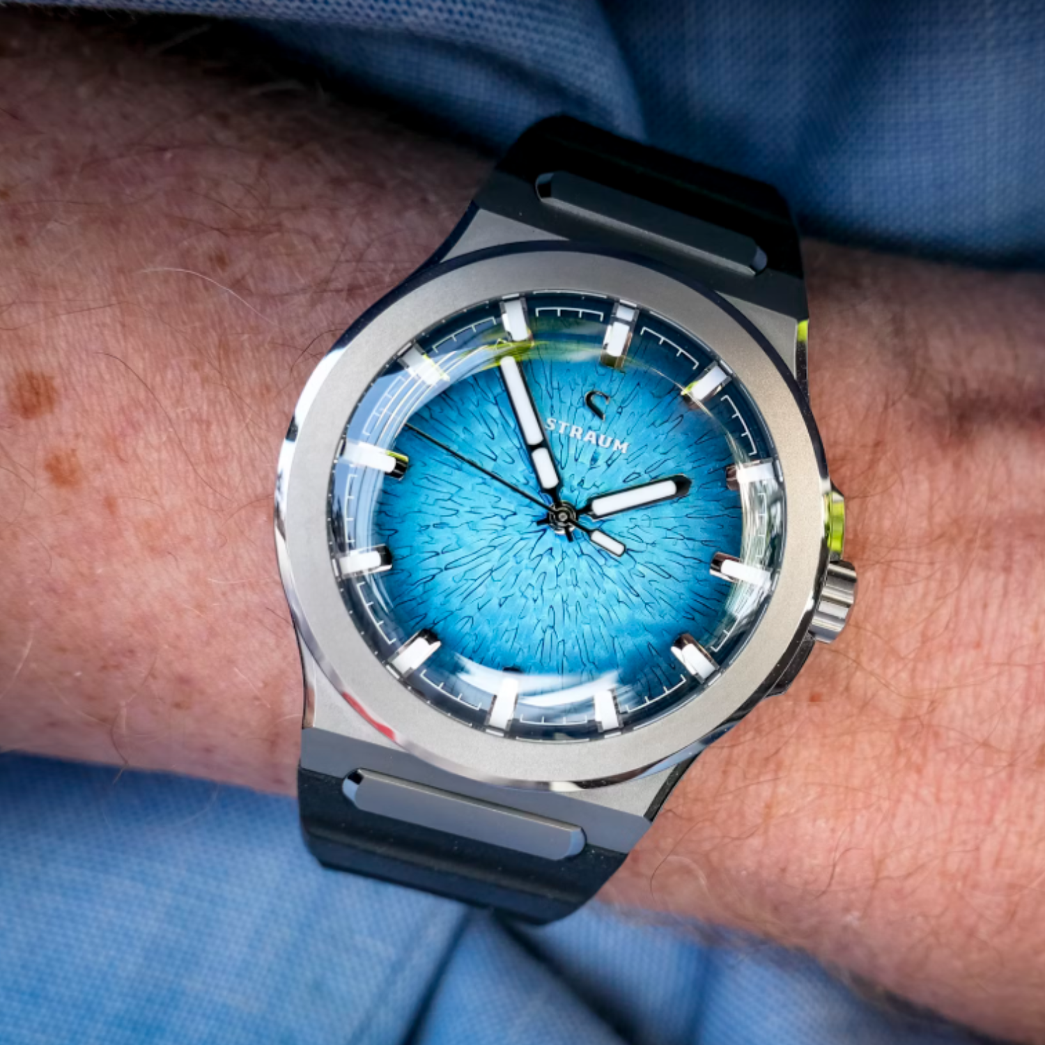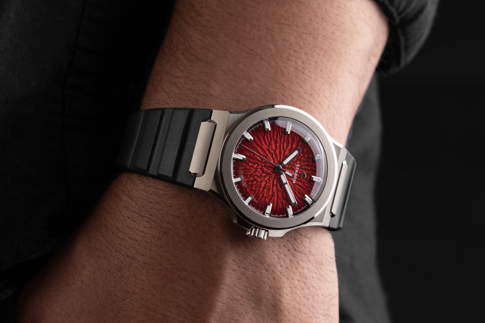The FKM Rubber Bands integrate seamlessly into the case via the Straum Coupling in Grade 5 Titanium. The curved tip follows the wrist’s natural shape, while the raised profile improves ventilation. They pair with the Straum buckle, machined from Grade 5 Titanium.