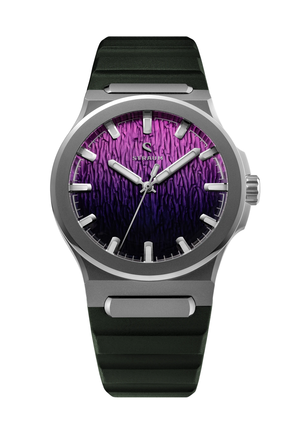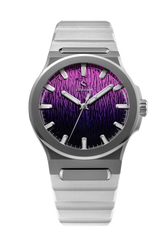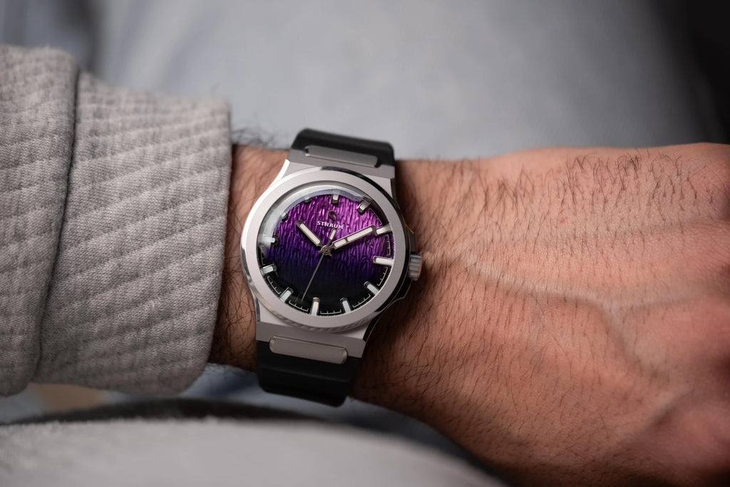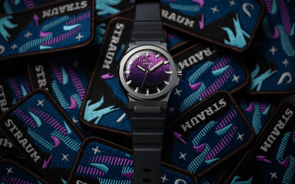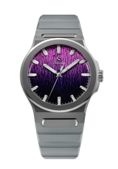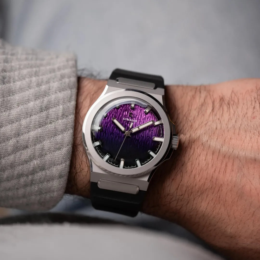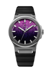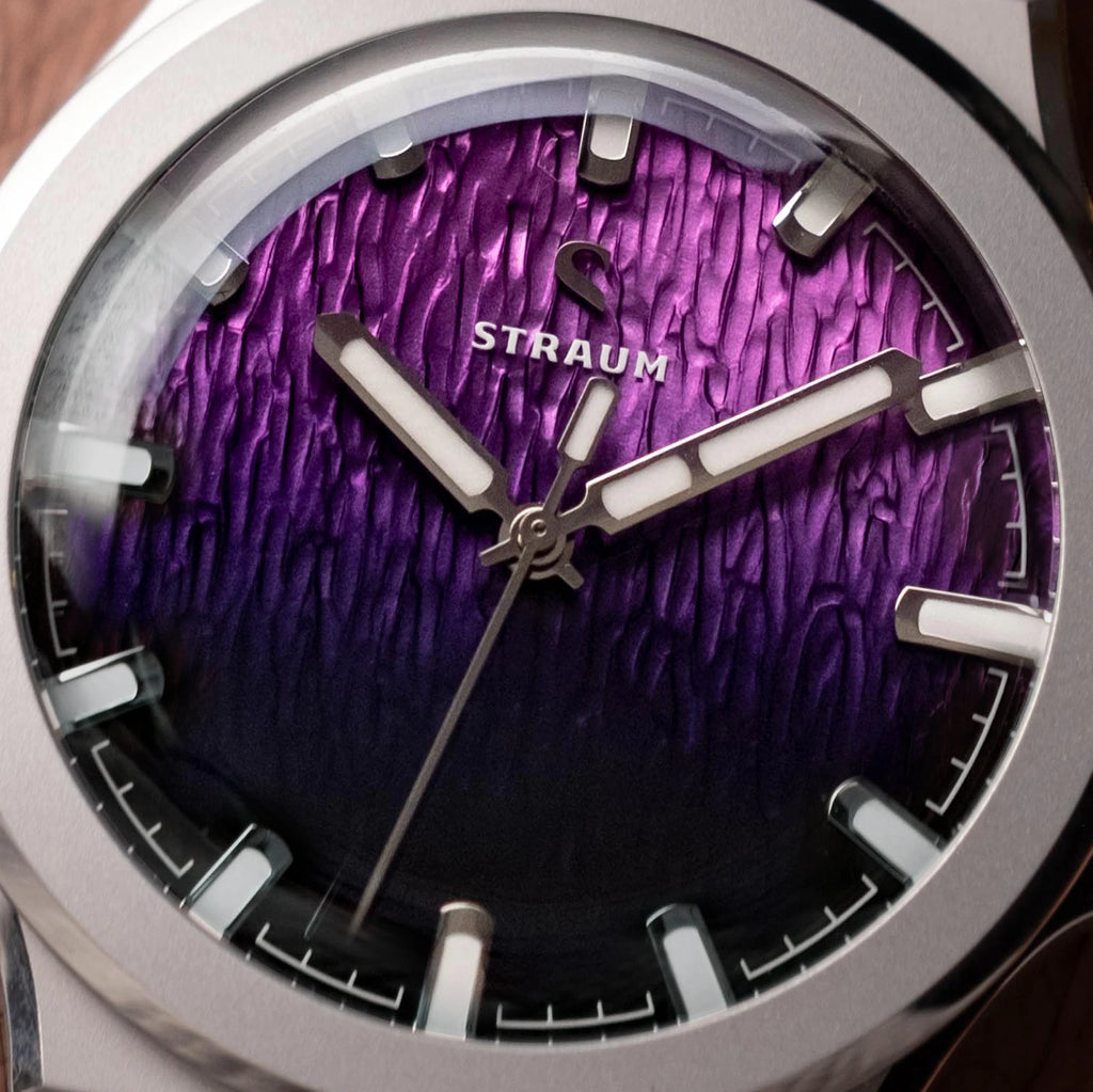 Jan Mayen Purple Borealis draws its color from STEVE — Strong Thermal Emission Velocity Enhancement — a river of superheated plasma flowing at over 13,000 mph through the upper atmosphere. The intense friction of ions against air produces a vivid purple glow that occasionally appears alongside the Aurora. The dial captures this in a rich gradient, transitioning from deep palatinate purple at the base to a fresh rose violet at the top, shaped by the Arctic series' signature stamped texture.