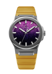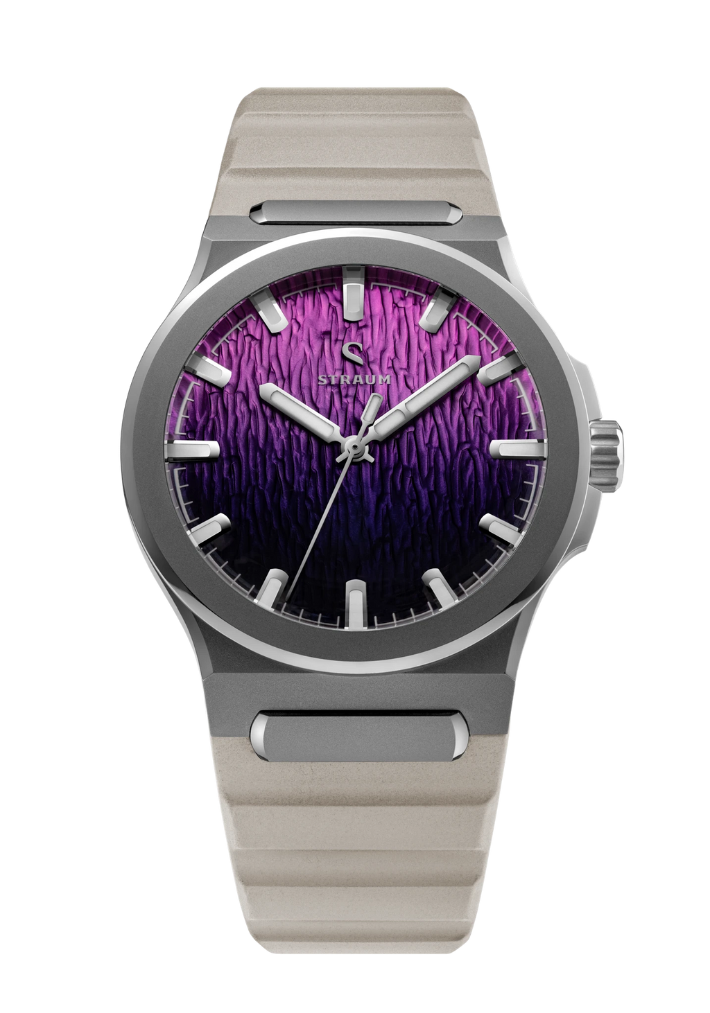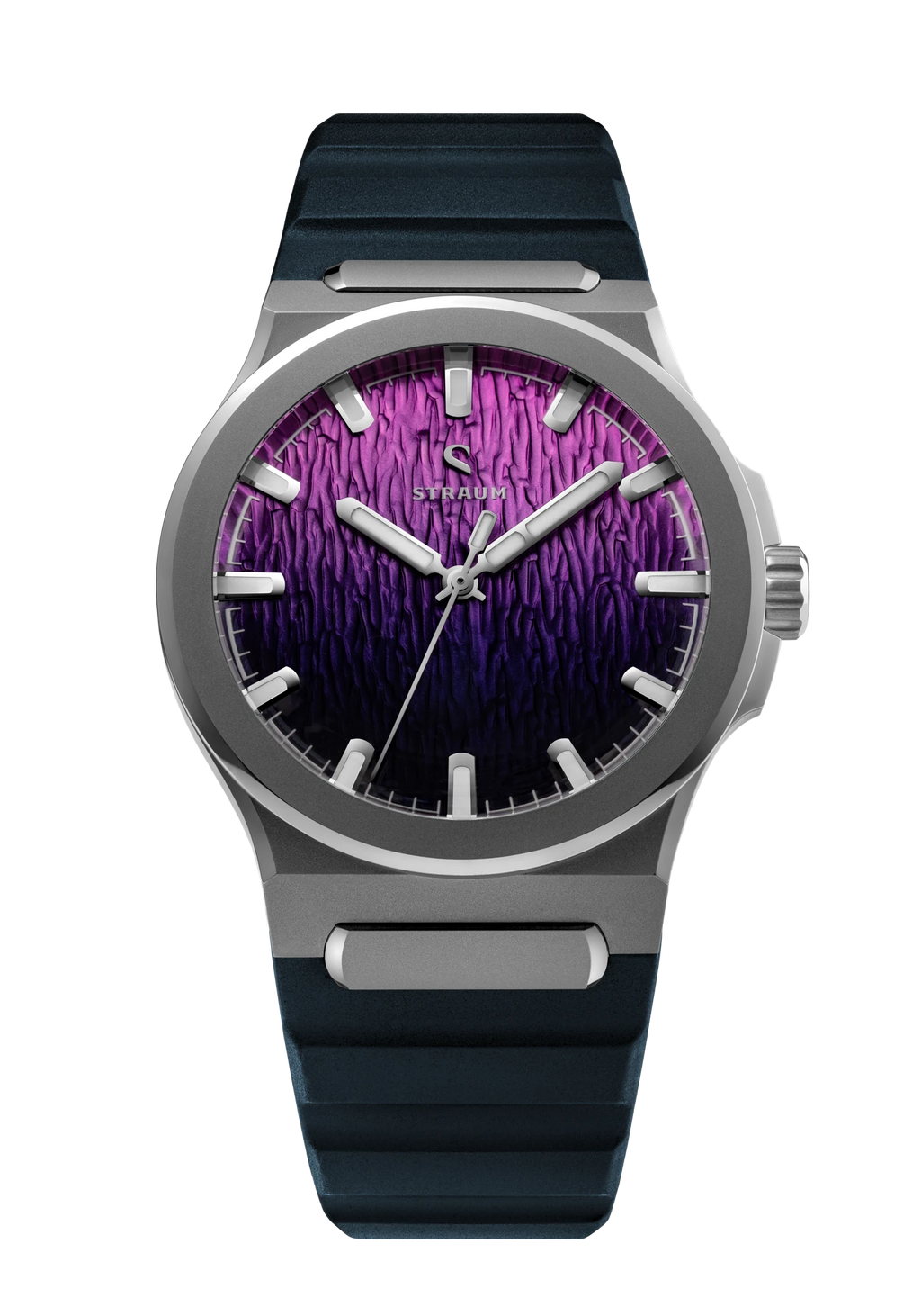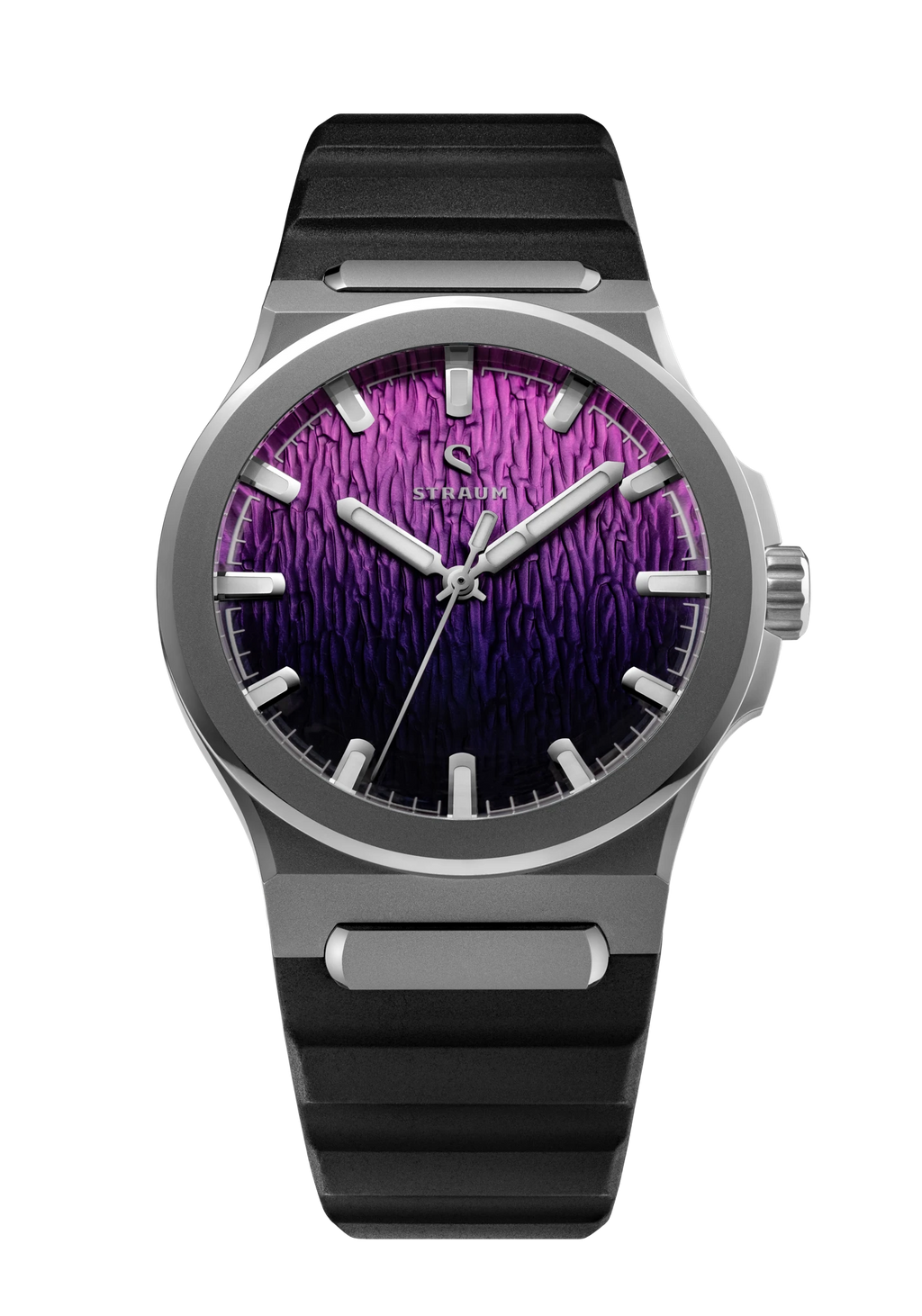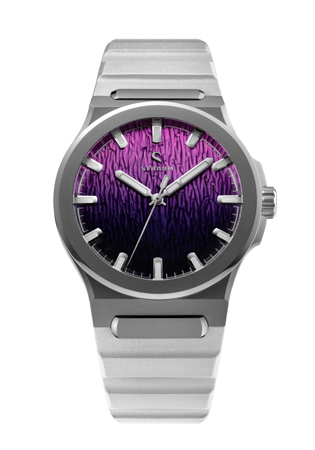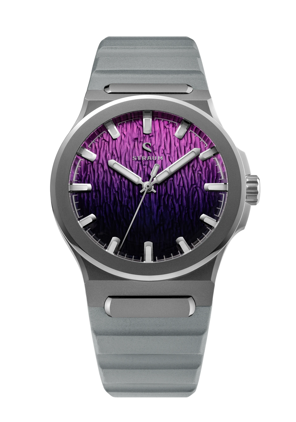 Jan Mayen Purple Borealis draws its color from STEVE — Strong Thermal Emission Velocity Enhancement — a river of superheated plasma flowing at over 13,000 mph through the upper atmosphere. The intense friction of ions against air produces a vivid purple glow that occasionally appears alongside the Aurora. The dial captures this in a rich gradient, transitioning from deep palatinate purple at the base to a fresh rose violet at the top, shaped by the Arctic series' signature stamped texture.
