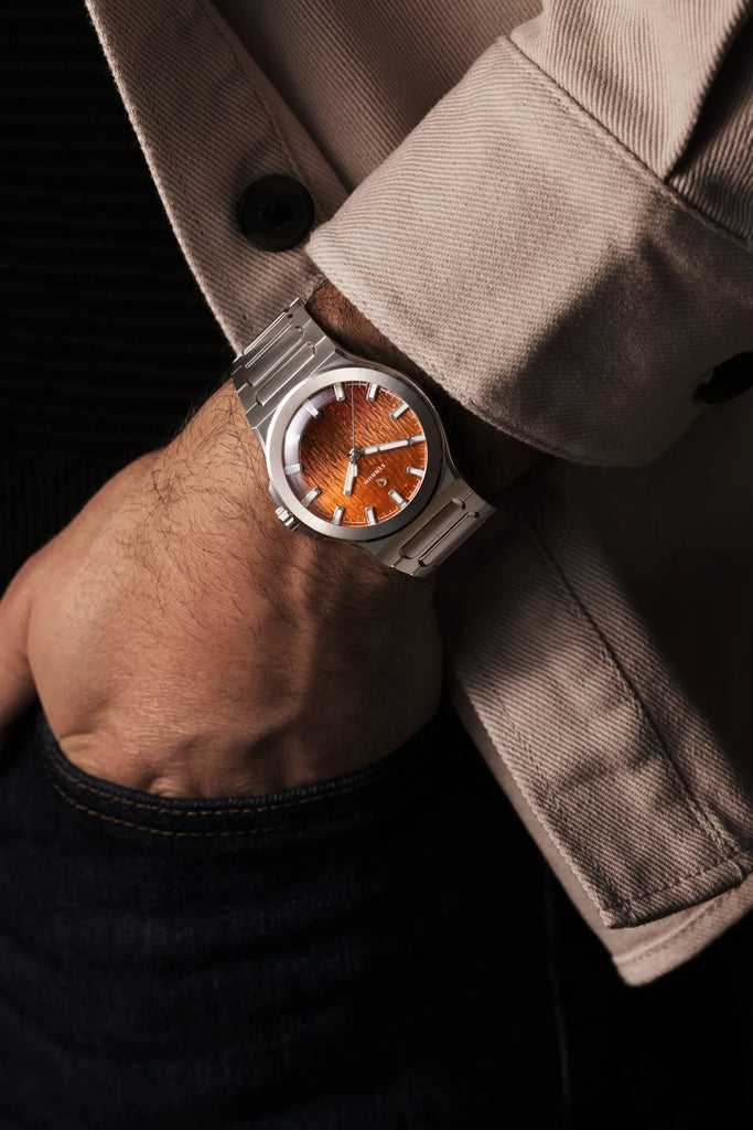 The watch case combines durability, functionality, and aesthetics. It is crafted from 316L stainless steel, which provides resistance to corrosion and wear, ensuring long-lasting performance and reliability. With a diameter of 39mm, it offers a comfortable and practical size for everyday wear. The sunburst bezel frames the double-domed sapphire crystal, which provides exceptional scratch resistance and ensures crystal-clear visibility of the dials. The grippy screw-down crown ensures that the 10ATM water resistance is maintained.