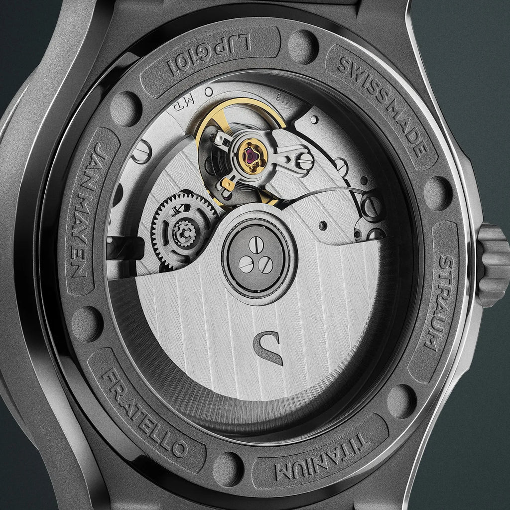 The Jan Mayen Titanium uses the LJP G101 by La Joux-Perret—an automatic, dateless movement with a 68-hour power reserve. Graded Soigné and adjusted in four positions, it’s visible through a sapphire screw-down caseback.