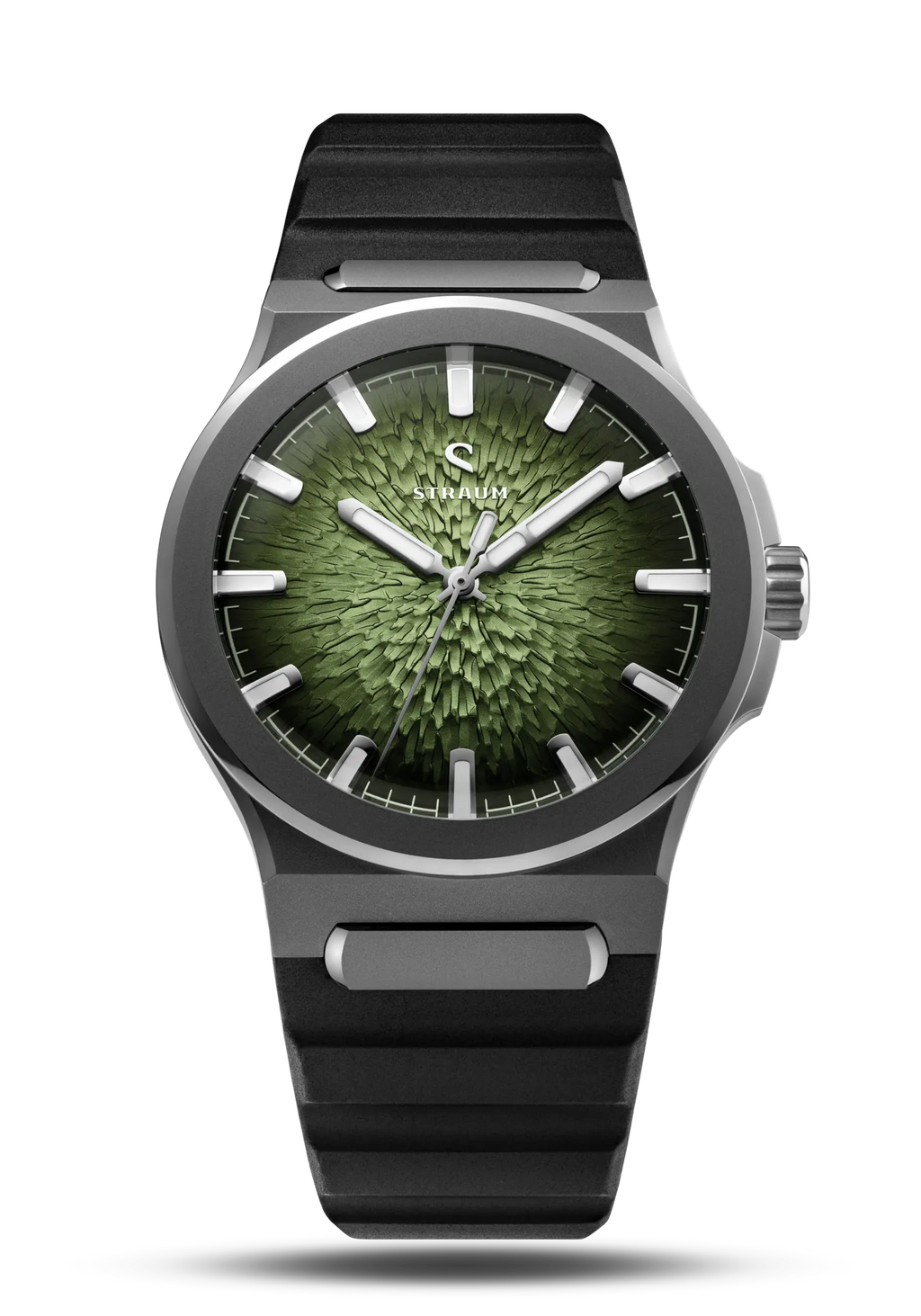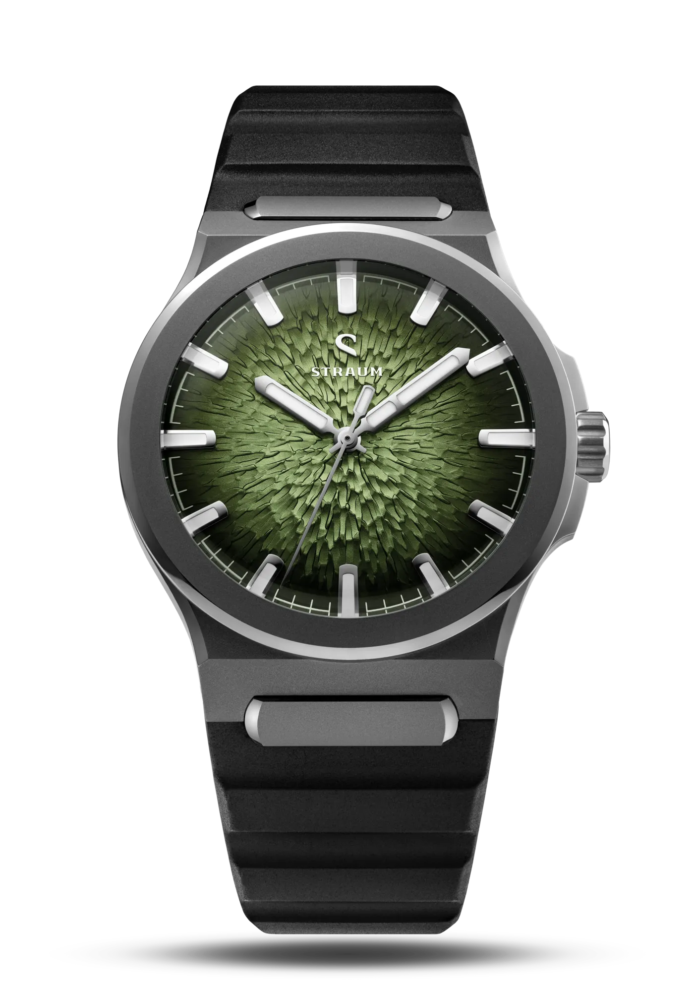 The FKM strap integrates seamlessly into the case via the Straum Coupling. Its curved tip follows the wrist’s natural shape, while the raised profile improves ventilation. It’s paired with the Straum buckle, machined from Grade 5 titanium.