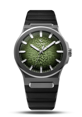 We carefully sculpt every dial detail in CAD software and then CNC machine a series of stamping tools with increasing fidelity. These are then used to stamp brass blanks in multiple stages, adding finer and finer details. Next, we apply multiple coatings, lacquers and fumés to establish depth and dimension. A final layer of clear coat is polished to a glass-like finish, resulting in a truly captivating visual experience. The applied logo and indices ensure contrast and legibility, while the ultra-sharp diamond-cut hands complement the intricately finished watch case. Additionally, all elements are coated with applied Super-LumiNova BGW9 for optimal visibility.